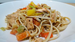 Ik vond heel toevallig glutenvrije linguine in de winkel. Dit werden mijn noedels. Tijdens het koken ervan, marineerde ik een grote moot zalm, in een mengeling van sesamolie, look en honing. In de wok stoofde ik eerst gemberpasta in wokolie, en daar voegde ik lente-ui, rode en gele paprika en een Thaïse groentenmix met uien, prei en paprika aan toe. Daar voegde ik de vis aan toe en de linguine, en om af te werken nog wat soyasaus, sesamolie en sesamzaadjes. Het geheel was lekker kruidig, pittig en een beetje zoet. Jammer genoeg vergat ik de hoeveelheden de dag zelf te noteren, dus het wordt mikken om dit opnieuw te maken. Maar het komt zeker opnieuw op ons menu!